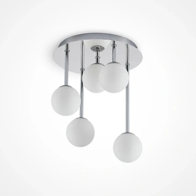 Constructed with high-quality materials, the Chrissy ceiling light features five spherical opal shades, each affixed to the ceiling mount via slender chrome-finished frames. This inventive arrangement creates an asymmetrical cluster that brings a stylish flair to your ceiling. The spherical glass shades are designed to ensure a uniform light emission from all angles, providing a soft and glare-free illumination that is gentle on the eyes. As the light shines through the opal glass, it produces a warm and inviting atmosphere perfect for relaxation or social gatherings.