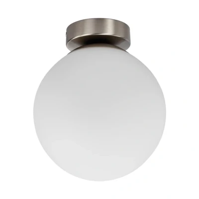 The ceiling light features a distinct circular ceiling fitting finished in satin nickel, pairing beautifully with its spherical lampshade crafted from opal white glass. This simple yet stylish combination not only enhances the aesthetic appeal but also allows light to be diffused evenly in all directions, creating a balanced and atmospheric glow throughout the room. The rounded shape gives the light a soft and inviting look, making it feel like a natural part of any decor.