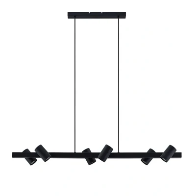 The Savoli Pendant Light is an elegant blend of industrial design and functionality, making it a perfect addition to any modern living space. Measuring 116 cm in length, this striking black pendant light features a robust steel frame and six adjustable spotlights, providing both aesthetic appeal and practical lighting solutions for your home.