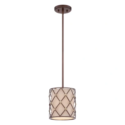 Elegance in design is heightened with this Brown Lattice mini pendant. The criss-crossed metal shade is studded with faux brass accents and adds visual depth to the fixture. The Copper Canyon finish contrasts beautifully with the enclosed tan fabric shade. Also available in this range; Medium Pendant, Large Pendant, and Semi Flush.