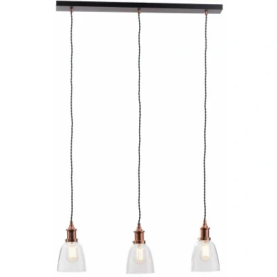 General description This Industrial Pendant Bar combines modern design with a touch of vintage charm, showcasing a copper finish and three elegant glass shades. This ceiling light is perfect for adding ambient lighting to dining areas, kitchens, or loft-style living spaces. Its bold, industrial appeal is balanced by the soft glow of the glass shades, creating a warm and welcoming atmosphere. Technical specifications Product Type: Ceiling Pendant Bar Bulbs Required: 3 (Not Included) Bulb Type: E27 Edison Screw Max Bulb Wattage: 28 Watt Max Bulb Voltage: 240 Volt Height: 128 cm approx. Width: 14 cm approx. Length: 80 cm approx. Shade Height: 25 cm approx. Shade Diameter: 31 cm approx. Drop: Max: 128 cm, Min: 31 cm approx. Material: Metal, Glass Colour: Antique Brass Weight: 3.3 kg Dimmable: Yes (With appropriate bulb & switch)