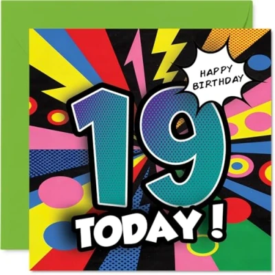 Brings a real sense of occasion, with cheerful graphics and a lively colour palette that shouts 'celebration' the moment it's opened. Birthday card with a light-hearted design style Features eye-popping multicolour and green details, with bold typography announcing their 19th birthday in style. Recyclable; printed in UK for a considerate choice Printed on quality gloss single sided board and uncoated inside-no smudging when writing inside. Made with FSC certified board for peace of mind Blank inside for your own message, so you can add a personal touch. Supplied with an envelope, so it's ready to send straight away. The 145mm Square format is convenient to display or post Proudly designed and printed in the UK using recyclable materials-ideal for anyone who loves a card that stands out from the crowd. Ideal for a son or daughter celebrating a milestone birthday