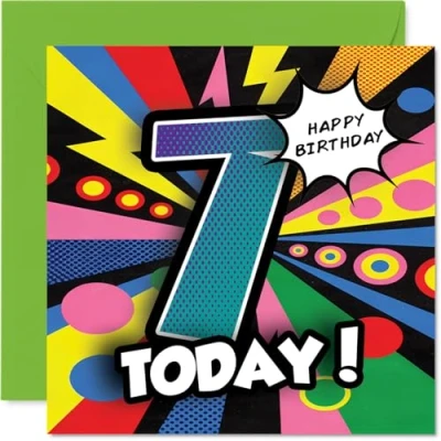 Nothing says 'let's celebrate!' like a bold, comic-inspired number 7 leaping off the card - perfect for sparking smiles on a milestone birthday Dynamic multicolour design with lively patterns brings the party to the front, making this card a real standout among their birthday surprises Printed on quality gloss single sided board with an uncoated inside, offering a sturdy feel. No smudging when writing inside - your message stays crisp Blank inside, so there's loads of space for your own cheerful wishes or a doodle. Comes with an envelope, ready for gifting. The 145mm Square format is convenient to display or post Created in the UK using FSC-certified and fully recyclable materials - a fun choice you can feel good about giving. Ideal for a son or daughter celebrating a milestone birthday