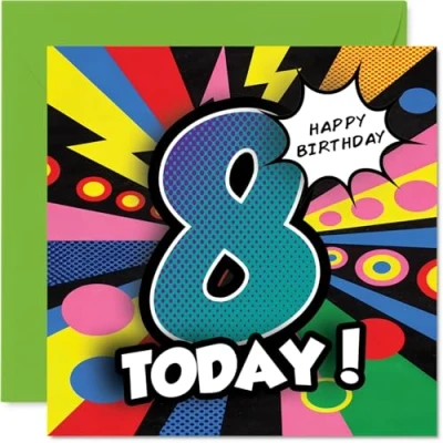 Packed with energy and colour, the playful comic-style number '8' pops off the card, making any birthday feel even more special. Birthday card with a light-hearted design style Features a vibrant design with lively comic book elements and a huge number 8, instantly grabbing attention and spreading joy. Recyclable; printed in UK for a considerate choice Printed on quality gloss single sided board with an uncoated inside - no smudging when writing inside and easy to personalise. Printed on 360 micron stock for a confident, premium feel Blank inside for your own unique message and comes complete with an envelope for effortless gifting. The 145mm Square format is convenient to display or post Proudly made in the UK using FSC-certified and fully recyclable materials - a card you can feel good about giving. Ideal for a son or daughter celebrating a milestone birthday