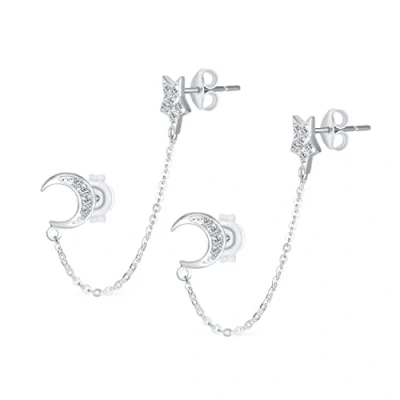 Celestial Crescent Moon Stars Double Pierced Cartilage Ear Lobe Helix Chain & Ball Stud Earrings For Women Body Piercing .925 Sterling Silver