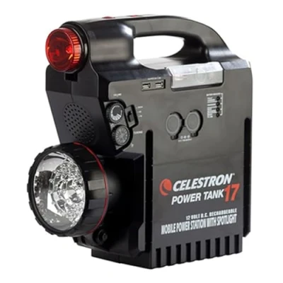17 AMP-HOUR POWER SUPPLY: Provides ample power for your Celestron telescope DUAL 12V DC OUTPUT: Two 12V DC output car jack sockets for charging EXTRA FUNCTIONS: Built-in AM/FM radio and siren 2 USB PORTS: Connect and charge portable devices via USB REMOVABLE RED FILTERED FLASHLIGHT: This is useful for finding accessories and referencing star charts in the dark