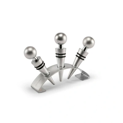 The CellarDine Three Piece Wine Stopper Set with Stand features three stainless steel wine stoppers with silicone rings for a secure fit on all 750ml bottles, keeping wine fresh for up to 48 hours, and includes a stylish stand for convenient storage. Manufactured by Dexam International Limited.