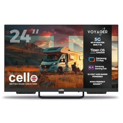 Built-in 5G Wi-Fi router with no extra boxes: The router is integrated inside the TV, so there are no messy external dongles or wires. It creates its own hotspot, letting phones, tablets and laptops connect and share internet anywhere you travel ULTIMATE GAMING HUB: Transform your travels with a pro-level gaming station built right into your TV. Stream the latest blockbusters directly from the cloud—no bulky consoles or messy wires required. Just sync a controller to enjoy endless family fun and high-speed action, even when you're miles from home. UPGRADED PITCH PERFECT AUDIO DESIGN: Equipped with the Cello Pitch Perfect Sound Speaker Enclosure, this TV features a deeper rear housing that provides clearer voice reproduction, improved bass performance, and fuller sound compared to ultra-flat TVs. POWERED BY TIZEN OS: Our TVs feature the cutting-edge Tizen OS for lightning-fast access to your favorite apps. With swift, intuitive software that ensures seamless navigation and instant streaming, it’s designed to provide the most responsive viewing experience available on the UK market. VOYAGER SMART TV: The perfect "go-anywhere" TV with a built-in Wi-Fi router. It creates its own internet hotspot for up to 32 devices, so your phones and tablets stay connected even in quiet, remote spots. Built tough for 12V/24V power, it’s the easy, all-in-one choice for your travels.