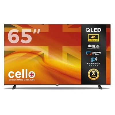 Cello 65 inch Tizen OS QLED 4K TV, Smart Frameless, 240V, By Samsung, 3 Years Warranty, Pitch Perfect Speakers, Netflix, Prime Video, Bluetooth, UK Made, Ideal for Motorhomes