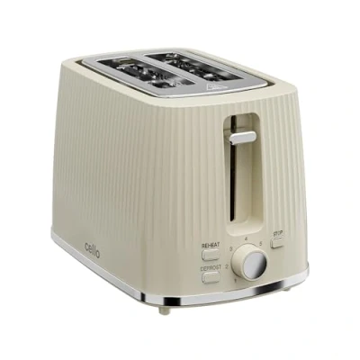 Cello 850W Cream 2 Slice Toaster with Wide Slots & 7 Browning Levels, High Lift, Crumb Tray, Cord Storage, Bread Illuminated Cancel Reheat Defrost Controls, Bl