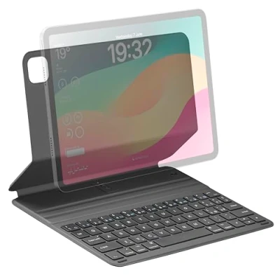Compatible with iPad up to 11", includes built-in wireless keyboard for smooth and intuitive typing, perfect for work and entertainment. Versatile folding design that transforms the case into a stand for writing, watching videos and navigation, with two adjustable angles for optimal comfort in any situation. Smart sleep mode system for energy saving: the case automatically deactivates the keyboard in case of inactivity and instantly wakes up when input detection. Built-in battery with up to one year life and battery level easily monitored via the device widget. Functional design with magnetic anchor ensures stable and secure attachment, a stylish and practical solution that does not alter the style of your iPad and offers an improved user experience
