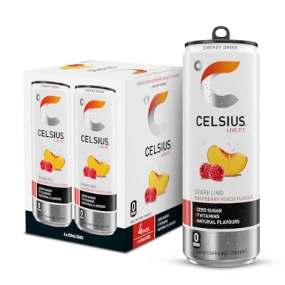 EVERYDAY ENERGY: Each CELSIUS energy drink delivers sustained, functional energy, specially formulated to work with your body and support your goals. FUNCTIONAL WELLNESS: Enriched with 7 vitamins, green tea extract, guarana seed extract, ginger root, with zero sugar. RASPBERRY PEACH: A sweet blend of raspberries and juicy peach flavors, this uplifting flavour combination of luscious peaches and softly tangy raspberries, will become an instant favorite in every delightfully refreshing sip. STAY SHARP: Celsius contains 7 Vitamins (B2, B3, B5, B6, B7, B12 and Vitamin C) which help support the normal functioning of your immune system. LIVE FIT: With each sip, feel the difference of a sugar free energy drink crafted for active lifestyles.