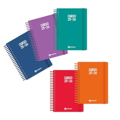 Functional and practical school pack: includes 5 a5 diaries in assorted colours with organization 2 days view per page and weekend on a page with special sections for students. Includes special student sections and stickers. Yearly duration from September 2025 to June 2026 Set of 5 School Diaries: This pack is perfect for families and fellow students of FP or university stages, each unit has a waterproof and flexible polypropylene cover spiral bound PVC with 360º opening STUDY PLANNER AND STICKERS: Inside pages includes everything a student may need throughout the year. Personal data sheet, 2025-2026 school calendar, semester class schedule, teachers chart, exam dates, reminders, deliveries, grades, justification absences-delays, semester planning, notes sheets and stickers to improve your daily organization in a visual way USEFUL AND HANDY - These planners are the perfect size to carry with you always. Its DIN A5 size with measurements of 21 x 15 cm, offers sheets with a sufficient size for your organization. It has a practical vertical elastic closure and a spiral binding for easy writing. Its flexible caps, made of polypropylene, offer waterproofing Environmental Respect and Quality: This diary contains 70gsm sheets ideal for smooth writing and is FSC certified ensuring that you are supporting the responsible annex of the world's forests