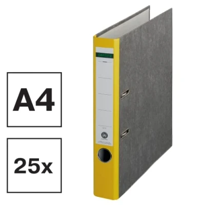 25 x standard binders with yellow spine and laminated cloudy marble coating, 5.2 cm spine width, holds up to 350 (80 g/m²) sheets, for everyday use at home or in the office Glued spine label, simple, individual labelling of the label possible Standard mechanism, with edge protection, slots and finger hole for easy and safe handling Blue Angel, durable cloud marble paper cover, firm stand thanks to locking the slots, LGA certificate Box contents: 25 Centra standard folders, cloudy marble paper in grey with yellow spine, dimensions 50 x 317 x 285 mm, A4, double perforation