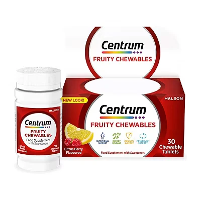 JoybuyCentrum Fruity Chewables are delicious, sugar-free chewable vitamins for adults, supporting immune health, energy, and cognitive function with key nutrients like vitamins C, D, zinc, iron, and B-complex. Easy to chew, two tablets daily provide essential nutrition without milk, lactose, gluten, or sugar.