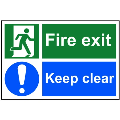 General description This safety sign indicates a fire exit that must be kept clear. Made from 1mm thick durable PVC, it features clear instructions and illustrations for easy understanding. The sign is printed with UV-resistant inks to prevent fading and has a strong water-based adhesive for secure attachment to walls. Technical specifications Material: PVC Size: 200 x 300mm Message: 'Fire exit. Keep clear' Compatibility and accessories Suitable for indoor use on walls and flat surfaces Can be used with standard wall mounting accessories if needed Installation Peel off the backing to expose the adhesive Position the sign on a clean, flat surface Press firmly to ensure secure attachment Usage Place in visible locations near fire exits Ensure the sign remains unobstructed and clearly visible at all times Other information Complies with BS5499 and ISO 7010 standards, helping to reduce liability in case of an emergency