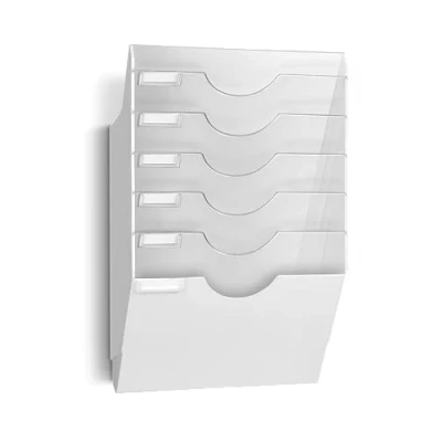 This good-looking wall display unit consists of an integral base assembly and 5 transparent adjustable dividers (giving from 2 to 6 compartments). Will take bulky documents larger than 24 x 32 cm format. Strongly made for heavy duty loads. Separate units can be assembled into vertical clusters and mounted side by side in banks. Fixing kit included. Size of 1 compartment : H 27,5 x W 33,5 x 2.7 cm. Overall dimensions : H 53,6 x W 34,6 x 14 cm.