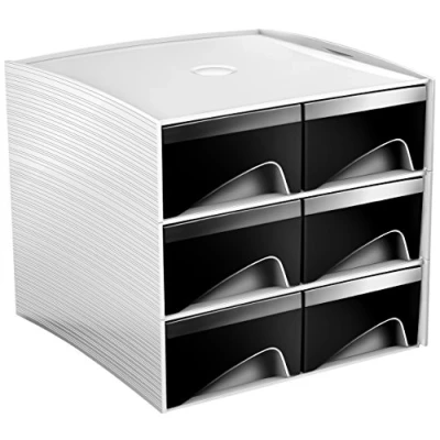 Ingeniously designed and very compact, this mini storage module will easily find its place on your desk to gather and store out of sight all your small accessories and office supplies : USB keys, staplers, post-it notes, paper clips etc. Ergonomic recessed handles ensure easy opening of the drawers. Drawers are fitted with retaining stops, but can also be removed easily from the module should it be required. Storage Stations can be stacked on top of each other, to create a tailor made storage solution for your workspace. Anti-skid pads included for secure positioning on your desktop. Made from 100% recyclable polystyrene. Overall Dim. 3 level Storage Station: 18.6 x 18.5 H 17.5 cm.