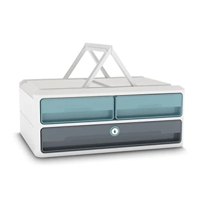 MoovUp, the agile module to meet the development of working modes. Perfectly stable on several levels on top of each other thanks to 4 relief and notches. PS durable, 100% recyclable. Dimensions: 368.5 x 274.5 x 146 mm. 2 half drawers for storing stationery (pens, calculator, A5 notepad) and computer accessories (external hard drive, USB stick, mouse, etc.). Positioned at the top for easy access via your keyboard 1 large drawer for your documents up to 24 x 32 cm format, tablet and laptop up to 14 inches.