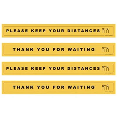 4 ground warning stickers to indicate in a very visible way safety distances to be respected. Indoor and outdoor use (anti-UV treatment). 2 stickers indicate “Please keep your distance" and 2 indicate "Thank you for waiting". Possibility to position them alternately, or to put 2 of them side by side. The high-performance adhesive guarantees optimum adhesion on flat surfaces indoors (excluding carpets and rugs) and outdoors in an environment between -20°C and +60°C. A non-level surface will reduce the adhesive's life span. The anti-slip grained surface is approved according to DIN 51097 (class A) and DIN 51130 (class R9). The anti-reflective finish ensures optimal legibility of the signs. Flexible and resistant adhesive PVC. Dim 680 x 80 mm Thickness 0.2 mm (will not be damaged when shopping trolleys pass over in supermarkets).