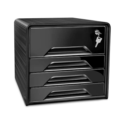 Euroffice4 sliding drawers accept documents and files up to 240 x 320mm. Made from 100% recyclable shock resistant polystyrene. Stackable. Ergonomic handles. 3 x slim drawers and 1 x larger drawer. Larger drawer is lockable for security. Colour: Black.