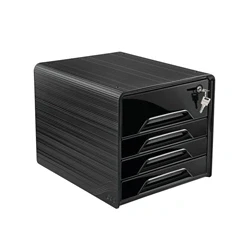 4 sliding drawers accept documents and files up to 240 x 320mm. Made from 100% recyclable shock resistant polystyrene. Stackable. Ergonomic handles. 3 x slim drawers and 1 x larger drawer. Larger drawer is lockable for security. Colour: Black.