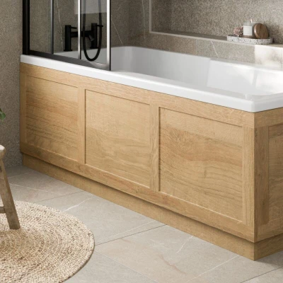 General description Now you have chosen your perfect Aquari bath, have a look at our stylish range of bath panels. We offer a wide range of colours, styles, and sizes so you can be sure to find one to suit your bathroom. A front bath panel is used when you are looking to install your bath into an alcove where only one side will be on display, and it is ideal for hiding the pipework underneath your bath. Technical specifications Dimensions (excluding plinth): 1700mm (W) x 445mm (H) x 15mm (D) Material: 15mm thick MDF Includes a 150mm high plinth Compatibility and accessories Suitable for use with straight baths End panel available for separate purchase Other information Stylish panelled design with an oak veneer finish CE marked product Helps to hide the underside of your bath Durable construction