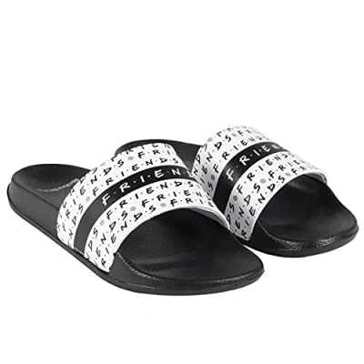 Adult flip flops - made of durable materials and pressed EVA sole, to provide better grip and safety when walking Pool flip flops - features a molded sole to the shape of the foot to ensure comfort at all times Summer Flat Sandals - Large Rubber Strap with F.R.I.E.N.D.S Print in Black and White Water Sandals - Perfect for enjoying at the pool or on the beach during summer days! Look for the full Friends collection and live a thousand adventures with the most famous group of friends on TV!