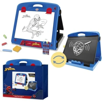 Official Spiderman design children's creative set, perfect for kids who enjoy the drawing, color and action of their favorite superhero; includes portable double-sided drawing board, crayon markers, colored chalk, and two erasers. The reversible board offers two surfaces to create: one white for down and one black for chalks, ideal for stimulating creativity and unlimited artistic play, with the possibility to erase and start again as many times as desired. Its structure is foldable, lightweight and easy to carry, ideal for carrying in backpacks or suitcases for travel, holidays, school activities or just for convenient and clutter-free play at home. It helps to develop children's creativity, motor coordination and personal expression, all without resorting to screens or devices, promoting a healthy learning and playing experience. Officially licensed Marvel Spiderman merchandise, made with durable and child-safe materials, designed to deliver hours of fun in an eye-catching and functional presentation, perfect for gift giving.