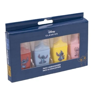 CERDÁ LIFE'S LITTLE MOMENTS Stitch Pack of 4 Highlighters Mini Size in Red, Blue, Yellow and Green With Disney Film Artwork Made ABS Plastic Original Product Designed Spain