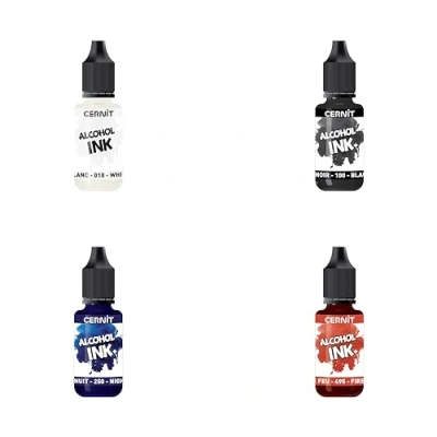 LOT 4 ALCOHOL INKS: each 20 ml bottle features an easy-to-use precision tip. All shades can be mixed together to create a new colour. ACID-FREE. MULTI-SUPPORTS: a coloured ink compatible with polymer clay, epoxy resin, paper, metal, plastic, ceramics, glass, etc. HOW TO USE: a few drops of ink allow you to colour a small area with maximum precision. FABRICATION: All Cernit alcohol inks are manufactured in Belgium, near Liège. DRYING: air-dry in just a few minutes.