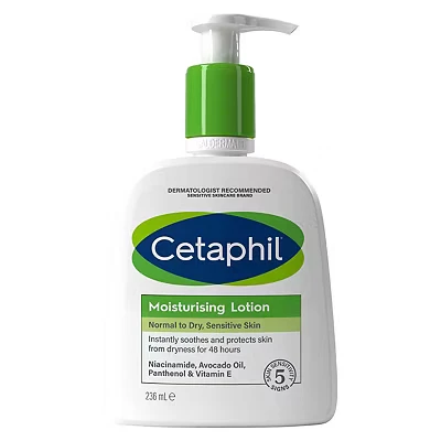 Cetaphil Moisturising Lotion 236ml is a lightweight, fast-absorbing moisturizer enriched with Niacinamide, Panthenol, Glycerin, and avocado oil. Clinically proven to soothe and hydrate sensitive skin for 48 hours, it defends against dryness and irritation; fragrance-free, non-comedogenic, and dermatologist tested for safety.