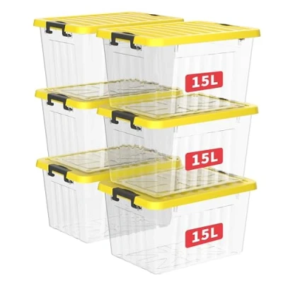 Cetomo 15L*3 Storage Boxes with Lids, Plastic Bins Latching Buckles, Click Closure, Stackable, Nesting, Organizer for Home Office Clothes, Clear & Yellow, 15L 3 Pack