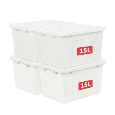 Cetomo 15L*4 Plastic Storage Box,White, Tote box,Organizing Container with Durable Lid and Secure Latching Buckles, Stackable Nestable, 4Pack, Buckle