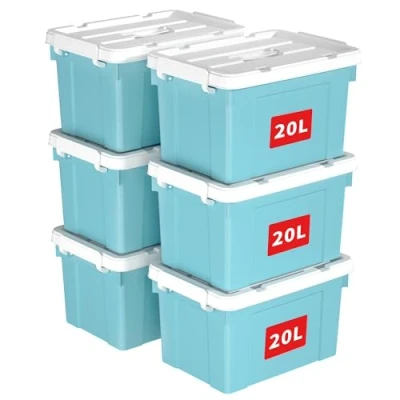 Cetomo 20L*6 Storage Boxes, Carry Plastic Box with Lids, Organizing Container Handle and Secure Latching Buckles, Stackable, Nestable, Tote Bin for Home Office Clothes, 20L 6Pack, Blue