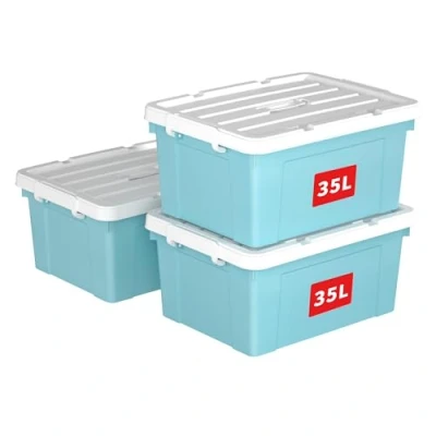 Cetomo 35L*3 Storage Boxes, Carry Plastic Box with Lids, Organizing Container Handle and Secure Latching Buckles, Stackable, Nestable, Tote Bin for Home Office Clothes, 35L 3Pack, Blue