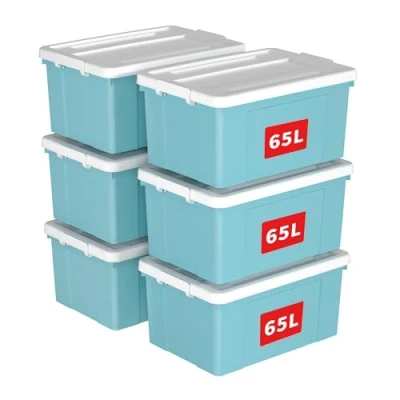 Cetomo 65L*6 Storage Boxes, Plastic Box with Lids, Organizing Container Secure Latching Buckles, Stackable, Nestable, Tote Bin for Home Office Clothes, 65L 6Pack, Blue