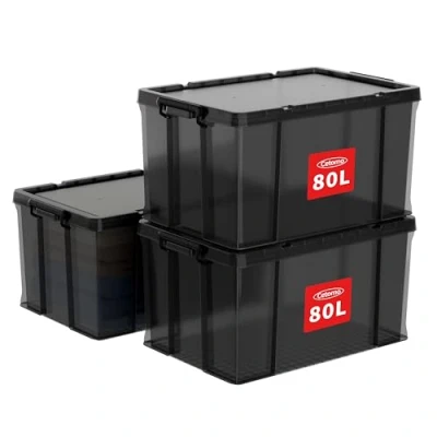 Cetomo 80L*3 Storage Boxes, Stackable Box with Lids, Heavy Duty Lidded Container Reinforced Corners, Vertical Sides and Clip Closure, Durable, Plastic, Clear Black, 80L 3Pack