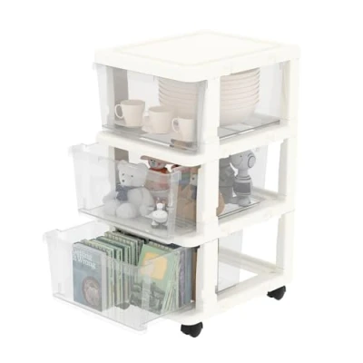 Cetomo Plastic Storage Drawers Unit, Drawer on Locking Wheels, Tower with Interlocking Hooks for Home Office Closet Bedroom Dorm, Detachable, Free Combination, Clear and White, 3