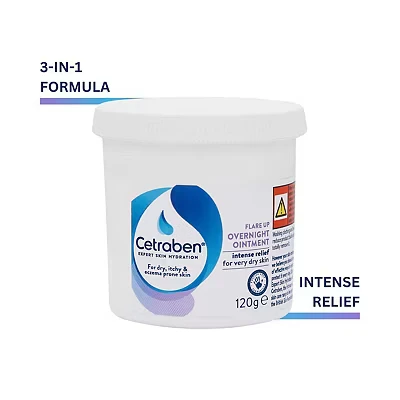 RICH FORMULATION - Cetraben Flare Up Overnight Ointment has a very rich formulation that provides intense hydration and locks in moisture, protecting the skin barrier from irritants and water loss BEDSIDE STABLE - The perfect bedside staple for when skin needs an extra hydration boost SUITABLE FOR - Adults and children over 1 year with dry, itchy, sensitive, and eczema-prone skin HOW TO USE - For best results, we recommend applying the ointment to slightly damp skin after bathing or showering; For night time and overnight use; our ointment is a perfect bedside staple for when skin needs that extra hydration boost TRUSTED BRAND - Cetraben is approved by the British skincare foundation