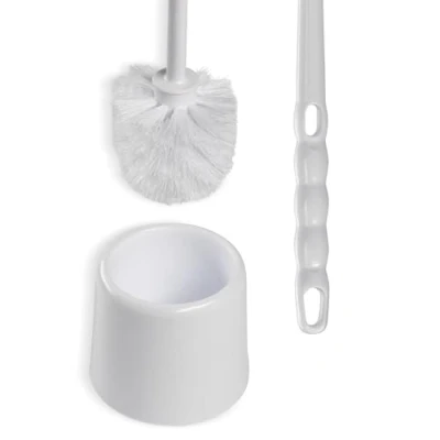 Staple set bristles in extra durable plastic handle Includes caddy for sanitary storage Long handle keeps hands at safe distance from toilet.