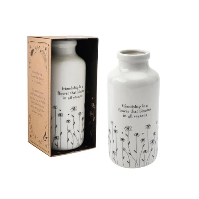 🎁 Introducing our White Ceramic Bud Vase, a symbol of enduring friendship and natural beauty. This dainty vase boasts a pristine white finish, providing a clean canvas for a captivating floral illustration that captures the essence of every season. 🎁 The delicate floral design, handcrafted onto the ceramic surface, breathes life into this charming bud vase. Each petal and leaf is intricately detailed, creating a visual celebration of nature's ever-changing splendor. Complemented by the heartfelt slogan, "Friendship Is A Flower That Blooms In All Seasons" this vase becomes a thoughtful and sentimental gift for cherished friends. 🎁 To enhance the gifting experience, we present this White Ceramic Bud Vase in a beautifully crafted gift box. The packaging not only protects the delicate ceramic but also adds an extra layer of sophistication, making it a ready-to-gift item for birthdays, celebrations, or just to show appreciation for a dear friend. 🎁 Dimensions | Height: 14.5cm x Width: 6.5cm x Depth: 6.5cm (180g) 🎁 Designed in Cornwall | From the Joy To The World collection by CGB Giftware | Item No. GB07474
