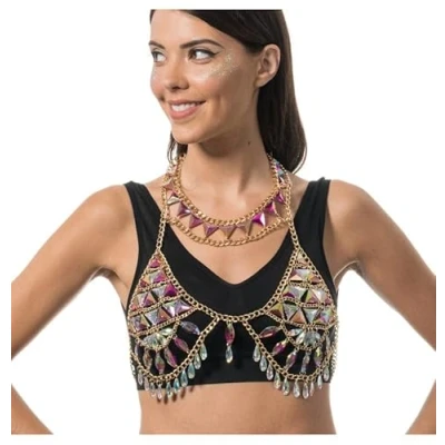 Sparkling eye-catcher for the summer: large, colourful iridescent plastic diamonds decorate your cleavage and make any bikini top a glittering highlight on the beach or at the festival Golden chains form a seductive harness top: like a jewellery net, they wrap around your body and bring out your silhouette in style Jewellery necklace meets back chain: the top is worn like a statement chain at the front and held securely at the back with a fine chain Expressive body jewellery for bold looks: combine it with bikinis, tops or bodysuits and attract attention at parties, festivals and beach events Shines like real jewellery, feels as light as a feather: the combination of sparkling plastic and filigree metal alloy ensures comfort with wow effect