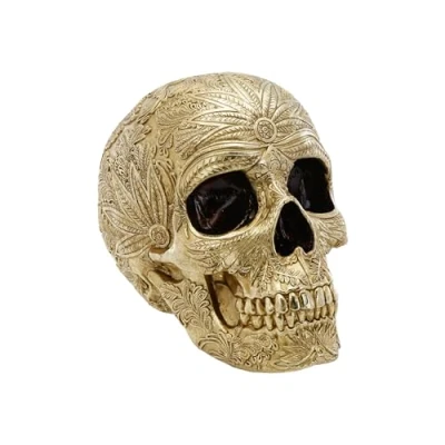Pattern and material: synthetic resin golden skull with filigree patterns of feathers and tropical plants for a spooky ambience Size and dimensions: 25 cm high, 15 cm wide and 19.5 cm deep - suitable for shelves, window sills or Halloween tables Use options: Halloween decoration for indoor or as an eye-catcher at themed parties and scary events Uniform design: continuous patterns create a harmonious ensemble and complete the Halloween mood with style and mystery Special feature: combines a scary look with a uniform pattern that fits well into different decorations