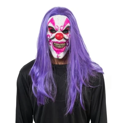 Scary appearance with strong effect: the clown mask with purple synthetic hair and nasty grin creates an unforgettable presence at events such as Halloween, carnival or horror parties - especially effective in gloomy surroundings Nightmare details for scary fans: jet black eyes, pointed teeth, pink ornaments and the bright red nose create a disturbing overall look that triggers goose bumps both in direct contact and from a distance Moveable latex for a comfortable fit: the mask is made of soft, pliable latex that adapts well to the face Purple synthetic hair for an eye-catching silhouette: the long hair in rich purple gives the mask a distinctive appearance - it can be hung freely or styled and significantly enhances the stage mature effect of the costume Versatile use for costume events: whether for theme parties, stage roles or Halloween performances, the mask can be combined effectively and works as a single piece as well as part of a larger horror concept, Manufacturer: CHAKS