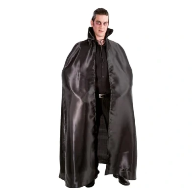 Elegant vampire look: black satin gives your outfit an elegant shine and creates a mysterious effect, especially suitable for classic vampire and Halloween costumes Versatile combination: whether vampire, wizard or warlock, the black cape complements numerous characters and offers plenty of freedom when designing your costume With distinctive collar: the eye-catching stand-up collar enhances the dramatic charisma and makes any Halloween or carnival costume even more effective Lightweight and comfortable to wear: at 163 cm in length, the cape looks impressive, but remains comfortable thanks to the lightweight material and can be worn for hours ESSENTIAL PARTY ACCESSORY: Whether it's Halloween, carnival or theatre, this cape is a versatile costume piece that instantly adds expression and presence to your outfit, Manufacturer: CHAKS