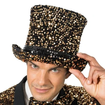 Extravagant party accessory: black top hat with bronze sequins makes for a spectacular appearance at any stage, celebration or theme party SHINY EYE CATCHING - All around with shimmering sequins that reflect light with every movement and create stunning glitter effects ONE SIZE FITS ALL - The top hat sits comfortably and securely on most heads - for long nights of dance, show and applause Stylish & eye-catching: with a height of approx. 19 cm, this hat stands out visually clearly and gives any look that certain extra MULTIPURPOSE - For New Year's Eve, Carnival, Festivals or Glamorous Events - This Hat Will Add Sparkle And Style To Any Outfit, Manufacturer: CHAKS