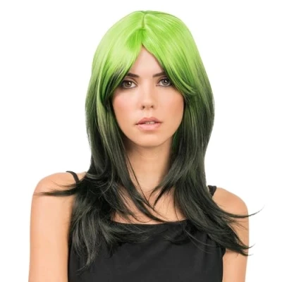 Two-tone wow effect: the extravagant combination of green and black provides a distinctive look, inspired by the iconic style of trendy pop stars Impressive length: 48 cm long, curved hair falls softly over the shoulders and brings movement to your outfit Stylish fringe for character and depth: the loosely falling fringe skilfully frames the face and gives your appearance an extra dose of expressiveness For special moments: whether cosplay, festival or carnival, this wig puts the crown on your costume and makes you the eye-catcher of any event Lightweight feel and effortless styling: the synthetic fibers are easy to style, lie comfortably on the head and make dressing up a breeze