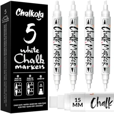 Chalkola 5 White Chalk Markers Dual tip, Fine & Jumbo Tip (1mm, 3mm, 5mm, 15mm) Erasable Liquid Pens for Blackboard, Chalkboard Signs, Car Window, Bistro, Glass Washable