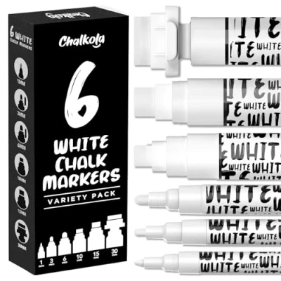 1mm | 3mm | 6mm | 10mm |15mm | 30mm - All in one set of White chalk markers fine tip (thin), extra fine point & bold tip (thick) - Time to replace the old dusty chalk with white chalk ink marker. Can Be Used On Many Surfaces - Use these erasable chalk paint markers to write on calendars, wedding signs, shop storefronts, milestone boards, classroom displays, LED boards, vinyl surfaces. Use as car window markers, bistro chalk markers. Perfect For Every Creator - Whether you're a teacher, artist, restaurant owner or parent, these dry erase chalk markers for blackboard create beautiful displays effortlessly in classrooms, menus, signs and home activities. Comes Off Easy - The white chalk marker will work on almost any surface! These chalk board markers are washable & will erase off on non-porous surfaces such as glass & mirrors (dry & wet erase) & permanent on porous surfaces (like wood). Long-Lasting Performance - While other markers crack and lose color under heavy use, our richly pigmented liquid chalk markers deliver smooth, consistent ink flow without skipping or fading. Tips resist fraying with continued use. Mess-Free Performance - Unlike regular chalk that creates dust and stains, these non-toxic dry erase markers for kids are washable, dustless and completely safe. No more dirty hands or chalk residue - simply wipe clean with a damp cloth. Vibrant White Color - Set includes highly opaque, bold white colors that show up bright and clear on dark surfaces. Quick-drying, smudge-resistant formula provides consistent coverage.